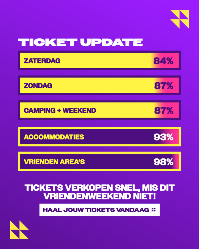 Dat zien we ook terug in de kaartverkoop, want die gaat écht als een raket. 🚀 De eerste twee fases waren in no-time uitverkocht. We hebben zelfs een fase moeten verlengen om niemand teleur te stellen en ervoor te zorgen dat vriendengroepen compleet konden blijven. En nu? De All Friend Sale gaat door het dak! 🔥
