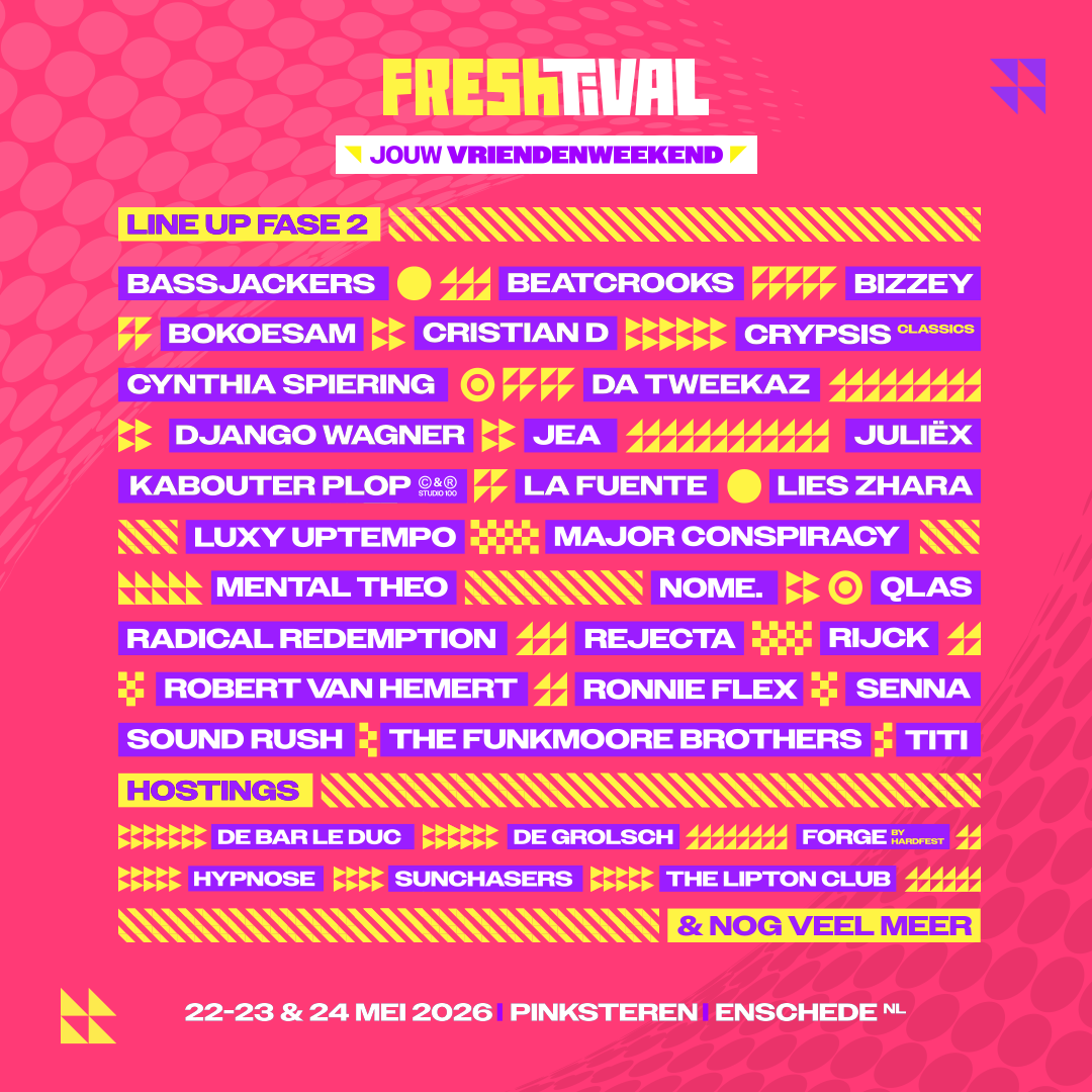 De line up voor jouw vriendenweekender op 22, 23 & 24 mei 2026 krijgt een flinke boost met de toevoeging van fase 2. Van Ronnie Flex en Bokoesam tot Titi, Major Conspiracy en Kabouter Plop (wat?!). Dit weekend is niets meer te gek.